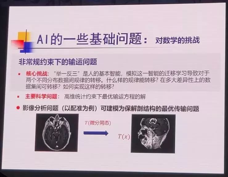 人工智能的很多问题都可以抽象为:将一个领域的数据转移到另外一个领域的数据,比如说机器翻译,就实现不同语言之间的转换问题。这自然就涉及到「什么样的数据之间能够进行转移」的问题。而众所周知,能够实现转移的前提是,两个领域之间的数据存在一「公共不变量」,这是数学的标准术语。比如说机器能翻译就存在语义这一不变量,例如医疗应用同样遵循这一思路,即 CT 图象转成核磁图象过程中,同一个人本身就是就是这个不变量。如何判断数据能够被转移,以及如何实现不同领域的数据转移问题,就叫做非传统约束下的传输问题。