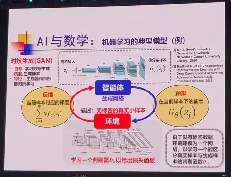 在开场前,他先从徐匡迪之问——「人工智能的基石在数学,我们有多少数学家投身进去了?」以及任正非答记者问时强调「人工智能的本质就是数学」的观点引入,表达了自己对于人工智能与数学之间的关系的看法:融通共进,一方面,人工智能的基础之一是数学,因此人工智能想要行稳致远,就必须先把数学的基本问题解决好;另一方面,人工智能的发展也对数学领域的研究产生了重要的推动作用。