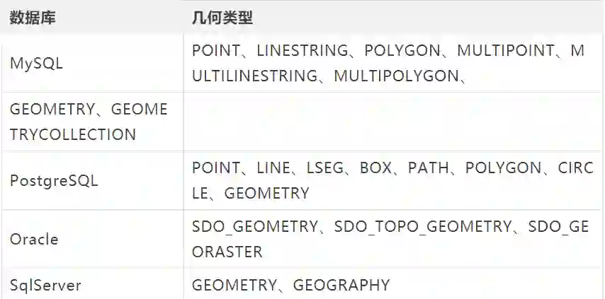 还有其它的几何类型,例如:Point、Polygon、MultiPoint、MultiPolygon 等等,介于篇幅的原因本文内容只针对 geometry 类型。