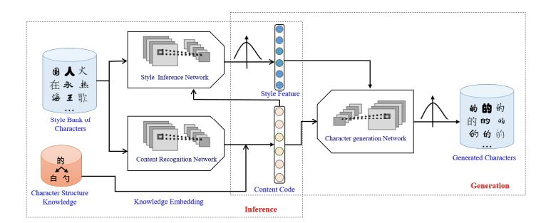 如图 2 所示,我们的模型,主要包含三个子网络,包括内容识别网络 C、风格推理网络 S,以及汉字生成网络 G。整个过程可以分为两个阶段——推理阶段和生成阶段。在推理阶段,首先,我们分别基于内容识别网络和风格推理网络将隐藏特征解耦成与内容和风格相关的成分。为了得到更多信息的内容编码,字体结构和部首的知识进一步被集成在内容向量中。在生成阶段,我们将内容向量和风格向量作为一个反卷积网络的输入,所以字体可以通过之前推理阶段得到的风格特征进行重构。为了可靠的解耦,训练过程是以交叉逐对的方式进行的,这意味着生成的汉字提取了不同的源汉字中的风格特征和内容编码。