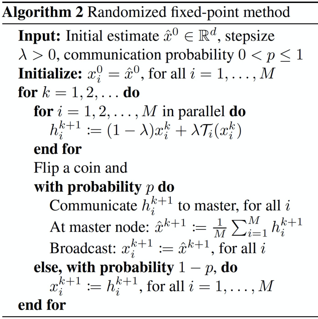 本文考虑两种不动点优化策略:第一种策略是对于每个客户端计算节点,迭代执行若干次某个操作序列(称之为局部步骤,local steps)。第二种策略是减少通信步骤的数量,即仅以一定的较低概率到中央服务器中共享信息,并且只在中间过程进行局部计算。