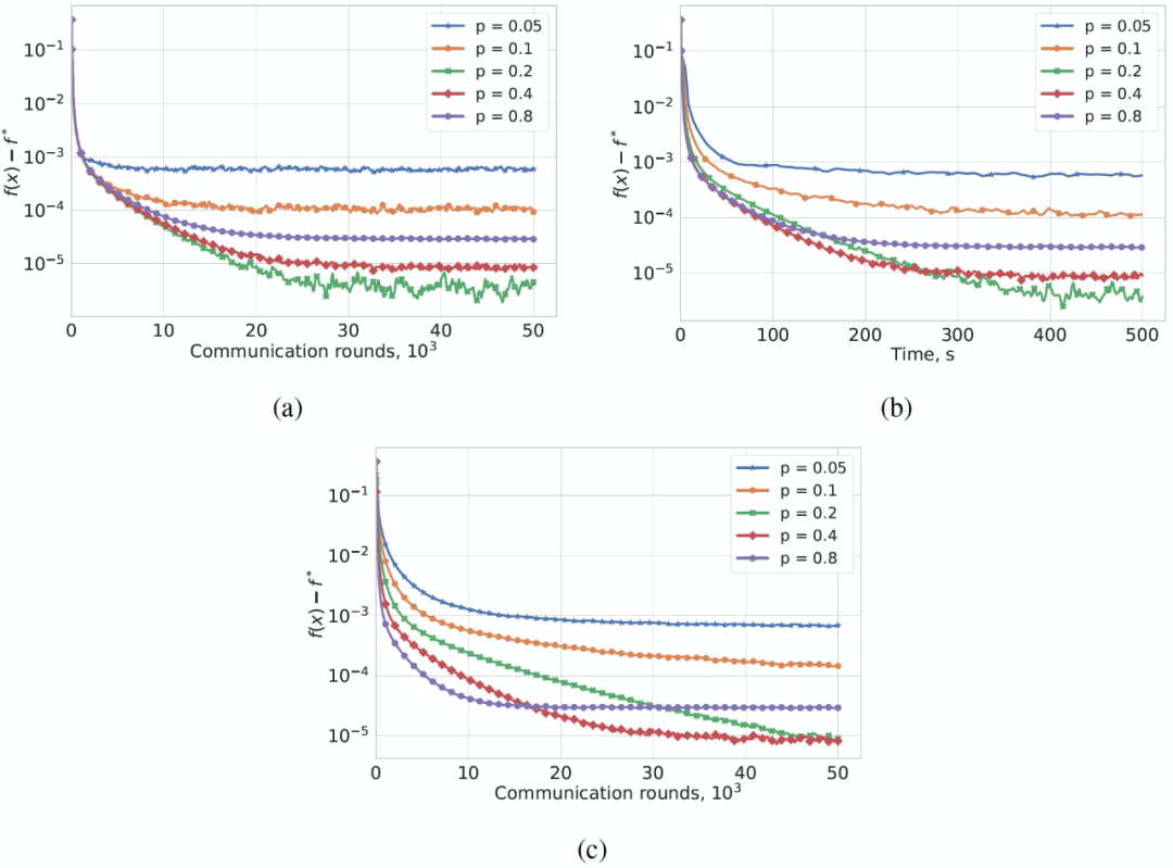 图 13. 梯度下降步长算法 2 的收敛性,λ=0.5,(a)梯度步长相同情况下,不同 p 值的通讯轮次数量,(b)梯度步长相同情况下,不同 p 值的计算时间,(c)梯度步长与 p 是成比例的,不同 p 值的通讯轮次数量。