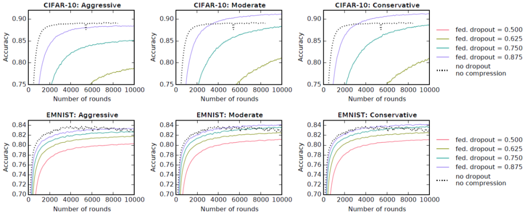 最后,作者进行了实验以验证将两种策略(有损压缩和 Federated Dropout)与客户端到服务器压缩方案(节 1.1.1 中文献 [1] 提出的方法)相结合时本文方法的效果。作者评估了本文模型在 3 种不同的压缩方案(Aggressive、Moderate 和 Conservative)和 4 种不同的 Federated Dropout 率(0.5、0.625、0.75 和 0.875)的表现。图 7 给出了 CIFAR-10 和 EMNIST 中的实验结果。重复每个实验 5 次,最终报告 5 次重复实验结果的平均值。对于所有三个模型,除了 Aggressive 压缩方案外,Federated Dropout 率为 0.75 时在所有压缩方案下都不会造成模型准确度下降。对于 MNIST 和 EMNIST,中央服务器到客户端的通信成本节省了 14 倍,客户端到中央服务器的通信成本节省了 28 倍,本地计算量减少了 1.7 倍,所有这些通信开销成本的节约都不会降低最终全局模型的准确性(有时甚至还能够提高准确性)。
