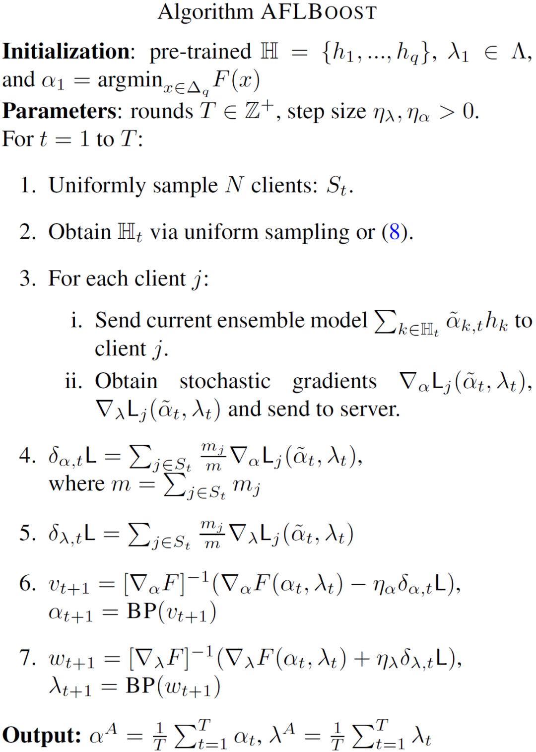作者提出了任务无关的 AFLBoost 方法优化上述目标函数。AFLBoost 可以看作是 FedBoost 和针对任务无关损失函数的随机镜像下降算法 [7] 的结合。AFLBoost 的详细算法流程如下: