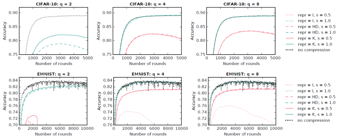 在实验部分,作者首先分别基于 CIFAR-10 和 EMNIST 库验证了压缩处理对本文方法的影响。由图 5 的实验结果,(1)对于每一个模型,都能找到一组至少与基线方法(no compression)相匹敌的压缩参数设置;(2)Kashin 表征方法对量化处理最为有用;(3)在中央服务器到客户端的通信过程中进行下采样处理的效果并不好。