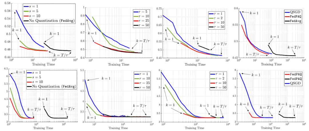 在图 10 中,前四个图展示了在 MNIST 数据集('0'和'8'位)上,T=100 次迭代的正则化逻辑回归问题的训练时间。联邦学习网络中共有 n=50 个客户端节点,每个节点加载 200 个样本。设置 C_comm/C_comp=100/1 来捕获通信瓶颈。第一列图中曲线显示了在中央服务器上每轮的训练时间与所获得的训练损失之间的关系。第二列图中曲线显示了参与更新的客户端数量 n 的影响。第三列论证了周期长度 τ 在通信 - 计算 tradeoff 中的作用。最后一列图比较了 FedPAQ 与其他两个基线方法 FedAvg 和 QSGD 的训练时间。后四个图为 CIFAR-10 数据库中神经网络的实验结果。具体图例与 MNIST 中结果相同。