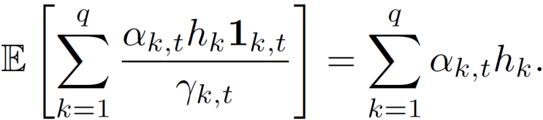 通过除以概率γ_k,t 的方式来解决这一问题,从而得出对集成的无偏估计: