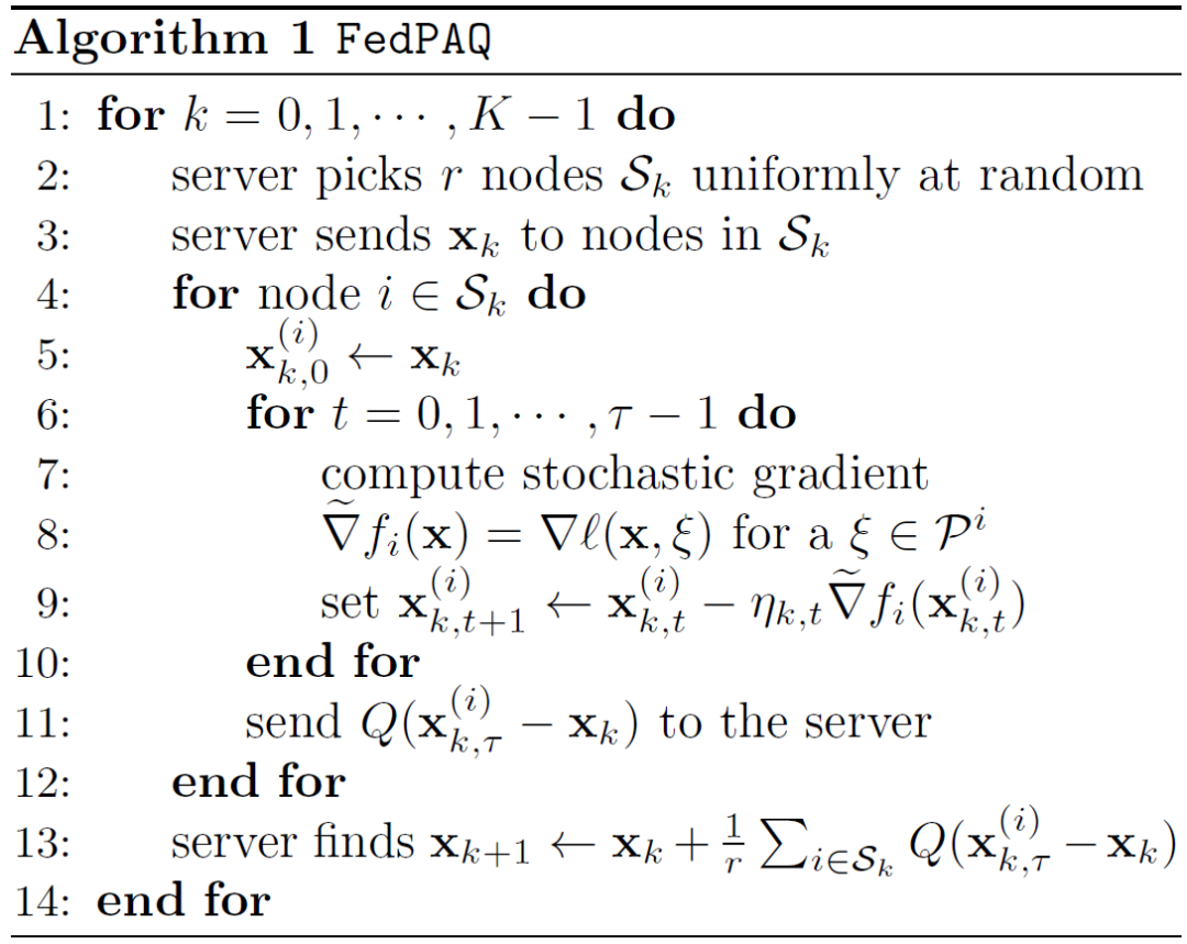 FedPAQ [6],量化处理本身也是压缩的一种方式。FedPAQ 允许网络中的客户端在与中央服务器同步之前执行本地训练,仅将活跃客户端的更新发送回中央服务器,且发回的仅为本地信息的量化版本。