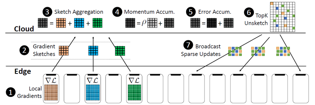 这篇文章中提出的 FetchSGD 使用 Count Sketch 来压缩模型更新,然后利用 Sketches 的可合并性来将不同客户端的模型更新进行合并。FetchSGD 设计中的一个关键问题是,由于 Count Sketch 是线性的,动量和误差累积都可以在 Count Sketch 中进行。这使得该方法能够将动量和误差累积从客户端转移到中央服务器中,从而在克服稀疏客户端参与挑战的同时,确保高压缩率和良好的收敛性。FetchSGD 的完整方法见图 8:(1)在客户端本地计算梯度,(2)将梯度的 sketches 发送到中央服务器中,中央服务器聚合梯度(3)sketches(4)动量和误差累积(5),(6)提取近似的 top-k 值,(7)中央服务器将稀疏值更新到参与下一轮训练的客户端设备中。
