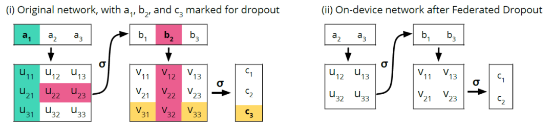 ,以及允许用户在全局模型的较小子集上高效完成本地训练的、能够同时减少客户端到服务器的通信成本和本地计算的 Federated Dropout。