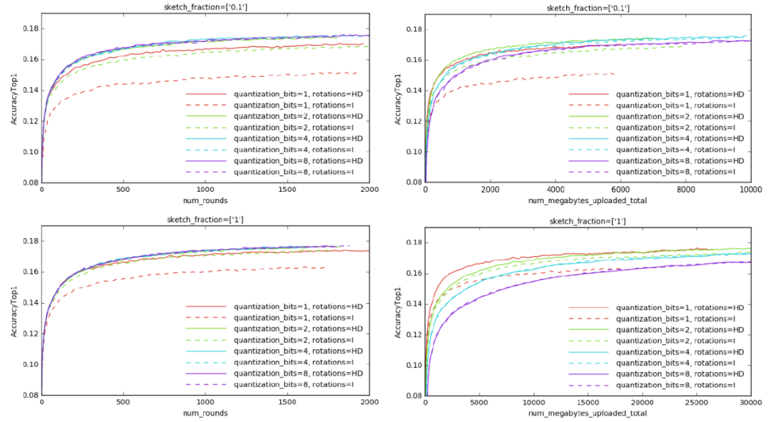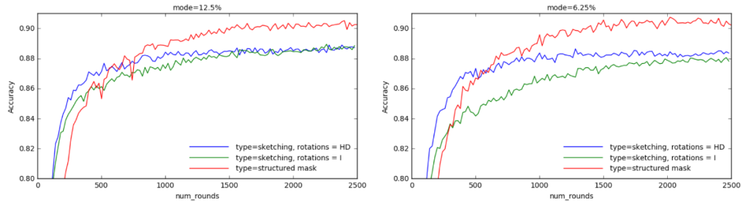 图 2. Sketching 比较,在 Reddit 数据上训练一个 LSTM 模型,每轮随机抽样 50 个客户端。