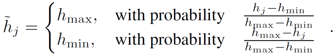 。首先,在客户端完整的计算模型更新(H_t)^i。在发送至中央服务器之前,以有损压缩进行编码处理。中央服务器收到编码后解码再进行聚合处理。生成 Sketch 的方法包括:(1)下采样(Subsampling),采样更新的平均值是真实平均值的无偏估计值 E[H^_t]=H_t。与随机掩模的结构化更新类似,下采样掩码在每轮中也是在每个客户端独立随机采样的,并且掩码本身可以存储为同步种子。(2)概率量化(Probabilistic quantization),即将模型的权重(weights)量化处理。对于更新(H_t)^i,令 h=(h_1, ..., h_(d1x2d))=vec((H_t)^i),h_max=max_j(h_j),h_min=min_j(h_j)。h 的压缩更新为: