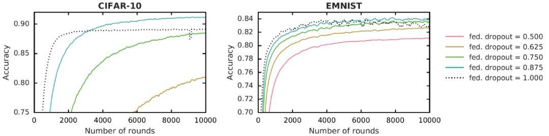 图 6. Federated Dropout 的结果,改变每层保留的神经元百分比