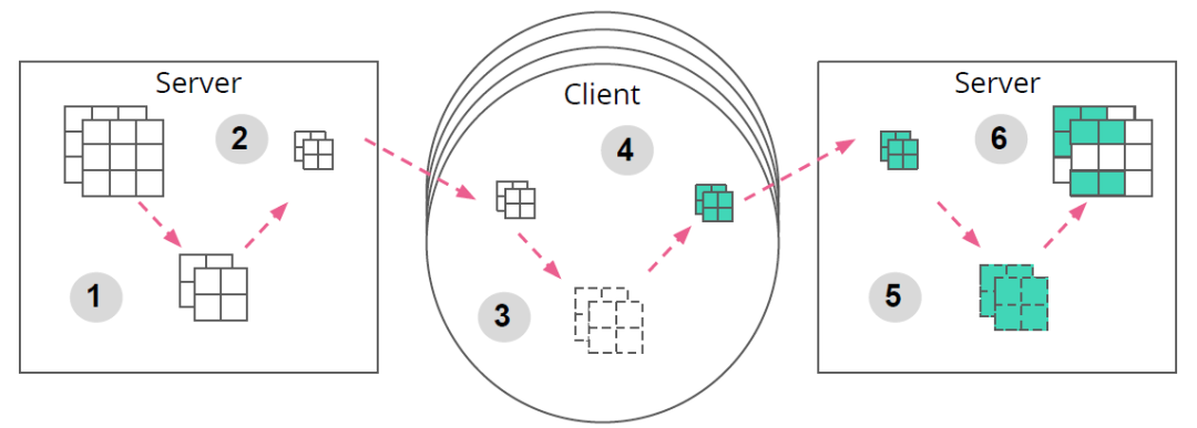 这些更新可以是在客户端上计算得到的单个梯度值,也可以是使用更复杂的计算方式得到的结果,例如,在客户端的本地数据集上执行多个随机梯度下降(Stochastic Gradient Descent,SGD)处理。选定的客户端会将更新发送回中央服务器,中央服务器通过聚合所有客户端更新来计算得到全局模型: