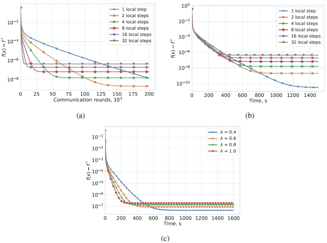 图 12. 具有梯度下降步长的算法 1 在均匀通信时间 t_n=nH 下的收敛性,(a)不同 H 值的通讯轮数,λ=0.5,(b)不同 H 值的计算时间,λ=0.5,(c)不同λ值的计算时间,H=4。