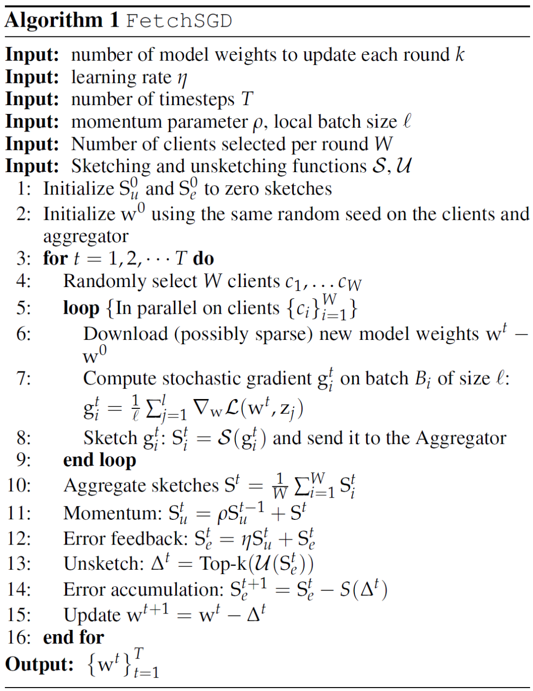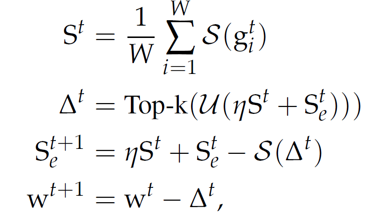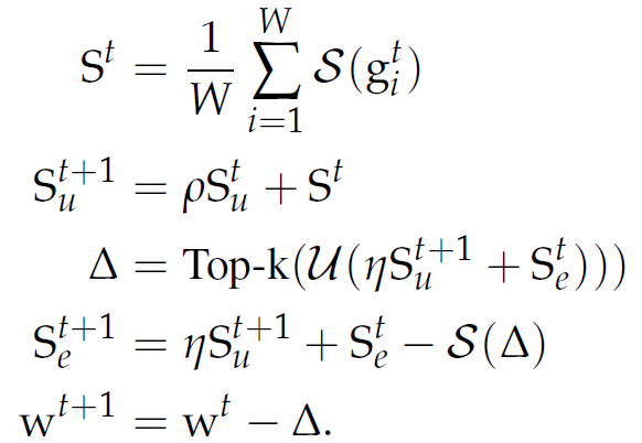 相比之下,其他有偏梯度压缩方法在压缩梯度时会给客户端带来偏差,因此客户端本身必须保持单独的误差累积向量。这在联邦学习中是很难保证的,这是由于客户端仅能参与一次更新,这样就没有机会在下一轮中重新引入错误。从另一个角度看,由于 S()是线性的,并且误差累积只包含线性操作,因此在 S_e 的中央服务器上进行误差累积相当于在每个客户端上进行误差累积,并将结果 Sketch 上传到中央服务器。更进一步,我们注意到动量也只包含线性操作,因此动量可以等价地在客户端或中央服务器上执行。推广上述方程可以得到: