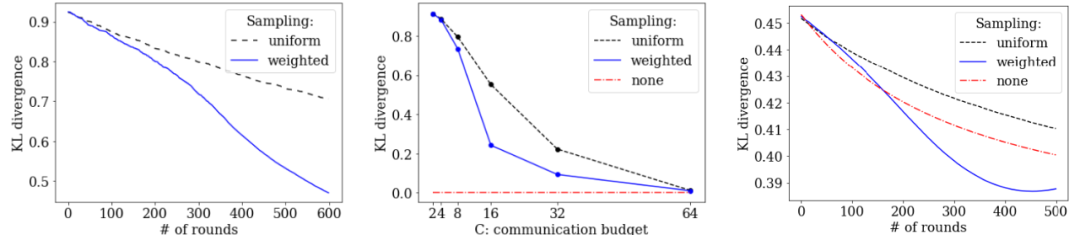图 11. 实验对比图。左:合成数据集的损失曲线比较;中:合成数据集中取样方法的比较;右:Shakespeare 联邦学习数据集的损失曲线比较。