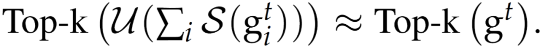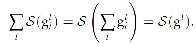 由于 Count Sketch 具备线性特性,中央服务器可以在给定 S((g_i)^t)的情况下,计算出每个小批量梯度 g^t 的 sketch: