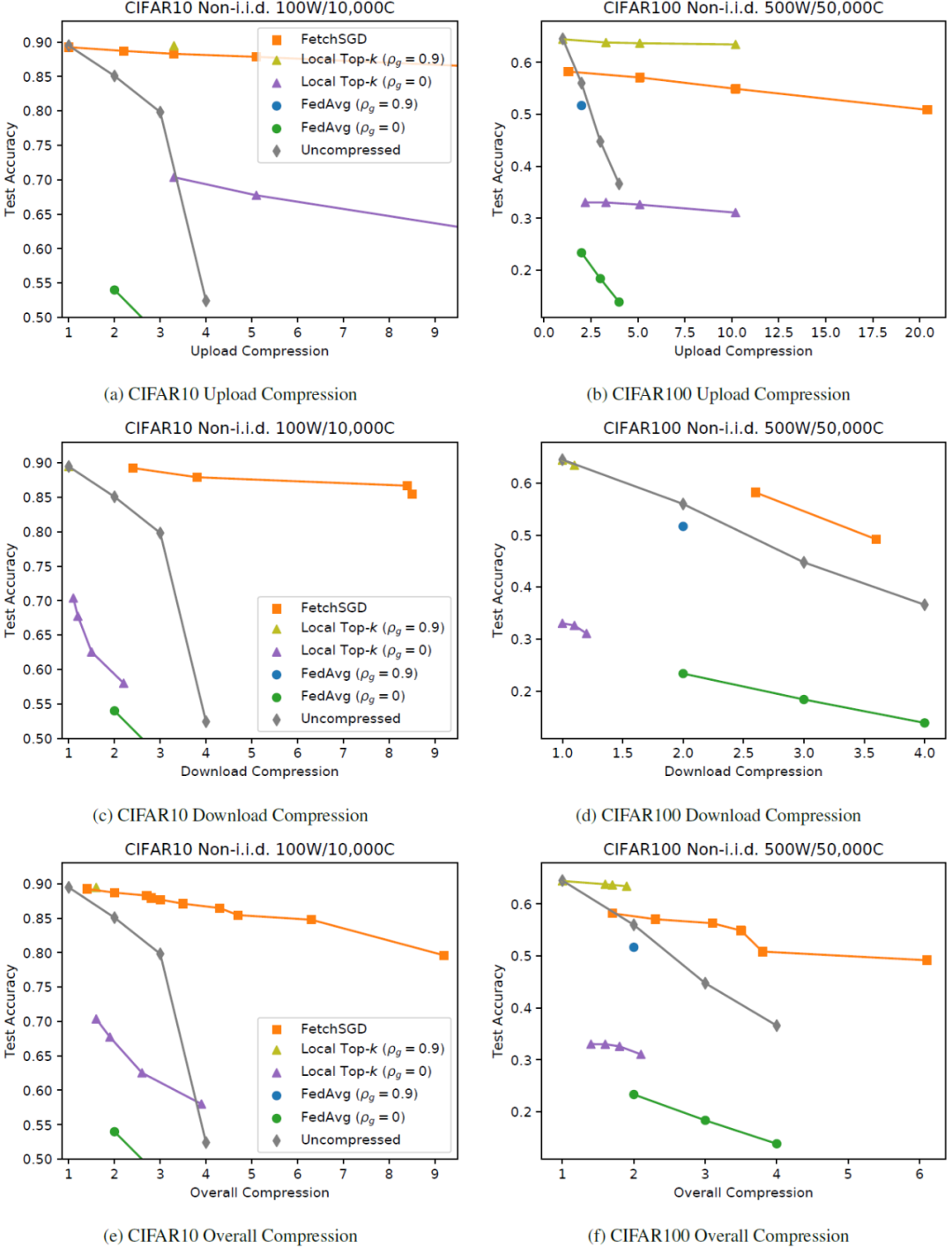 实验中,作者以上传和下载的总字节数表征相对于未压缩的 SGD 所实现的压缩效果。这些数据中没有考虑到的一个重要因素是,在 FedAvg 中,客户端必须在参与之前立即下载一个完整的模型,因为每个模型的权重在每一轮中都会得到更新。相比之下,局部 Top-k 和 FetchSGD 每轮只更新有限数量的参数,因此未参与的客户端可以相对更新当前模型,从而减少了必须在参与之前立即下载的新参数的数量。这使得本地 Top-k 和 FetchSGD 的上传压缩比下载压缩更重要。下载压缩对于这三种方法(FedAvg、Top-k、FetchSGD)也不那么重要,因为目前边缘设备的互联网连接的下载速度往往远远高于上传速度。作者给出了整体压缩(包括上传和下载)的结果,在图 9 中把这些图分成单独的上传和下载部分进行展示。FetchSGD 在不同的数据集和上传、下载和整体压缩的任务中,表现都较优。