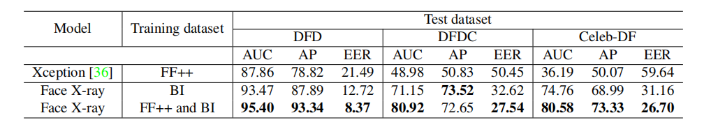 在测试部分评估了Face X-Ray使用四个数据集的泛化能力。这四个数据集包括:Face Forensics++、Deepfakedetection、Deepfake Detection Challenge、celeb-DF。
