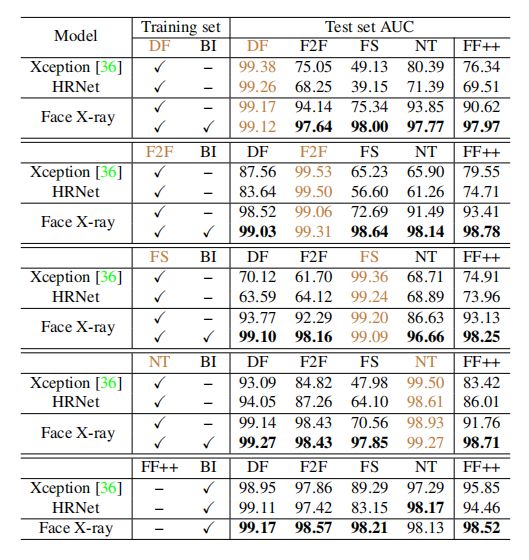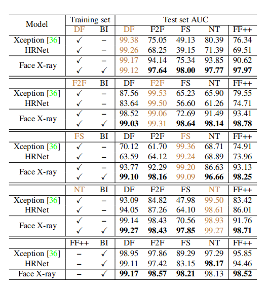 首先使用与Xception相同的训练集和训练策略来评估Face X-Ray检测模型。为了得到准确的Face X-Ray图像,将真实图像作为背景,将换脸的图像作为前景,给出一对真图像和假图像。为了公平比较,还给出了二元类的结果。结果如下图所示: