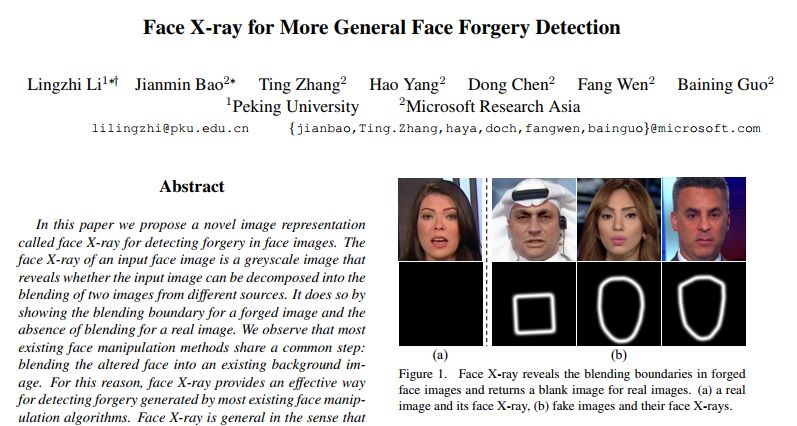 此项技术发表在论文《Face X-Ray for More General Face Forgery Detection》中,据研究人员在相应的论文中指出,此类工具有助于防止换脸图像被滥用。