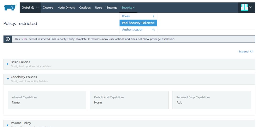 受限制的和不受限制的PSP在RKE和Rancher中是相同的,因此它们在安装时激活的内容是一样的。Rancher允许无限数量的额外PSP模板,所有这些都可以在全局范围内处理。管理员定义PSP,然后将它们应用于Rancher管理的每个集群。与前面讨论的RBAC配置类似,它将安全配置保存在一个位置,并大大简化了策略的配置和应用。