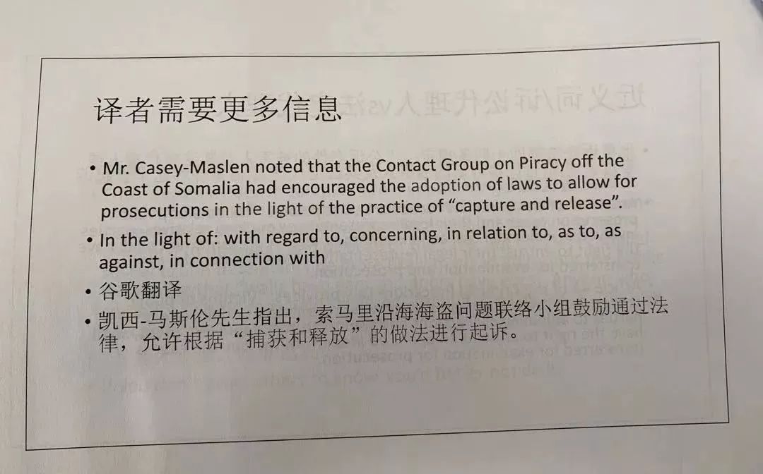 李长栓老师也认为专业翻译大部分时间是用来查资料的,他举例,“某一个先生指出,索马里沿海海岛问题,联络小组鼓励通过法律允许根据捕获和释放的做法进行起诉”,看 完之后不知所云,这就是机器翻译的结果。