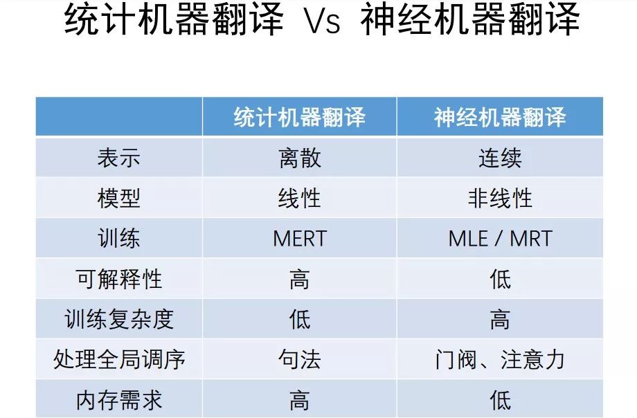 2015年后,深度学习在机器翻译得到应用。深度学习的主要意义在于它可以从数据中自动提取表示,就不需要像以前一样设计特征来描述翻译规则,只需要设计一个网络,让机器自动在数据去寻找表述,效果非常好。但还是有难解决的问题,它根本不知道数字是什么意思,不知道为什么出错,不知道怎么去改动它,而且很难控制。