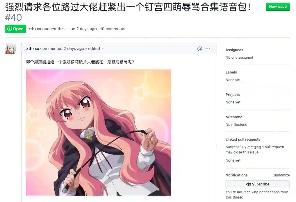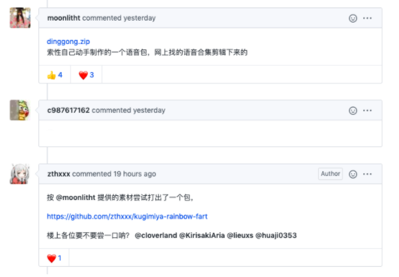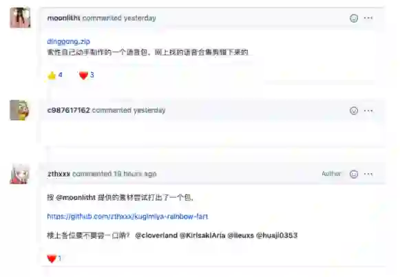 GitHub上的协作效率可能是程序员社区最高的,大家真是有钱出钱有力出力都没有的给个吆喝,你切音频我打包,钉宫理惠辱骂版扩展包分分钟出炉!程序员中的老二刺螈们都大呼:「斯国一~」