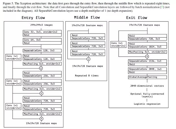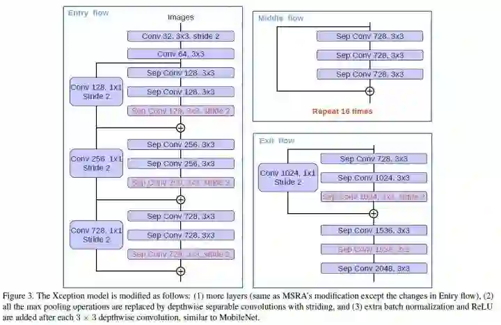一种 Xception module 的线性堆叠,并且使用了 residual connection,数据依次流过 Entry flow,Middle flow 和 Exit flow。