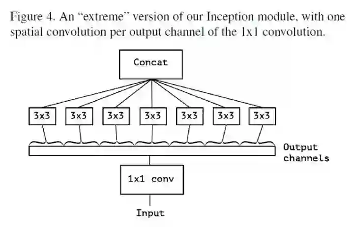 沿着上面的思路,一种极端的情况就是,在每个 channel 上进行 separable convolution,假设 1x1 卷积输出的 feature map 的 channel 有 128 个,那么极端版本的 Inception 就是在每个 channel 上进行 3x3 的卷积,而不是学习一个 3x3x128 的 kernel,取而代之的是学习 128 个 3x3 的kernel。