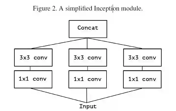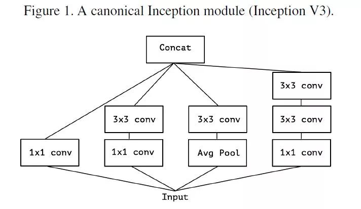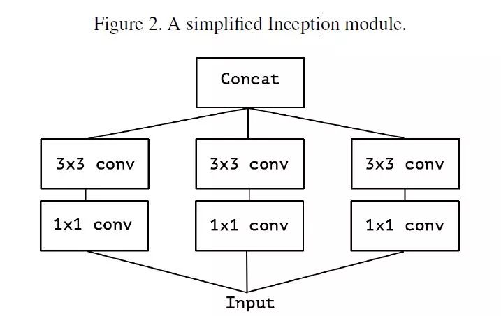 首先考虑一个简版的 Inception module,拿掉所有的 pooling,并且只用一层 3x3 的卷积来提取 spatial correlations,如 Figure2。