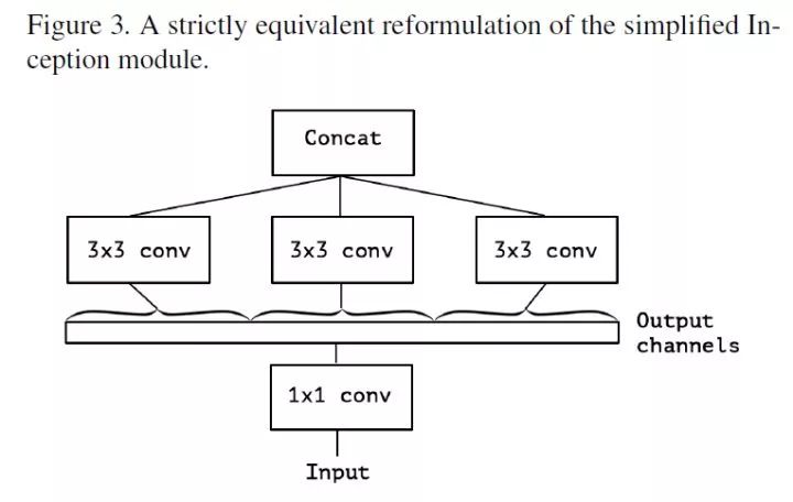 这样一来就自然而然地引出:为什么不是分出多个不重叠的部分,而是分出三个部分来进行 separable convolution 呢?如果加强一下 Inception 的假设,假设 cross-channel correlations 和 spatial correlations 是完全无关的呢?