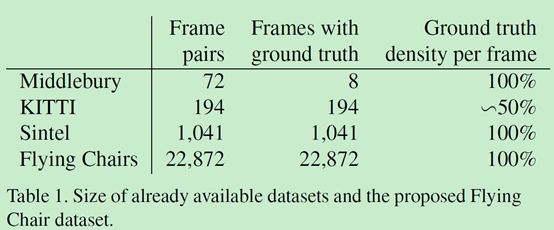 2. 已有光流数据集太小,很多没有标注真实值,本文创建了一个新的光流数据集FlyingChairs,用来充分训练CNN。