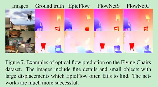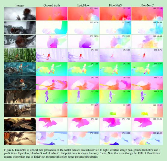 EPE是一种对光流预测错误率的一种评估方式。 指所有像素点的gound truth和预测出来的光流之间差别距离(欧氏距离)的平均值。 可以看见Epicflow 这个很好的预测方法,但在一些大位移的情况下会找不到光流,而两种flownet好于它。