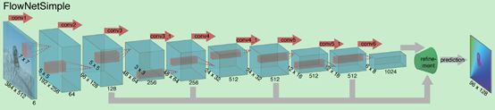 “FlowNetSimple”只有卷积组成的架构。其方法是把输入图像堆叠起来,让它们通过一个非常普通的网络,网络自己决定怎样处理图像对,从而提取光流信息。在这个卷积网络种有九个卷积层,其中的六个stride设置为2,每一层后面还有一个非线性的relu操作,这个网络并没有设置全连接层,所以其不能够把任意大小的图片作为输入,卷积filter随着卷积的深入不断减小,第一个7*7,接下来两个5*5,之后是3*3,featuremaps因为stride是2每层递增两倍。