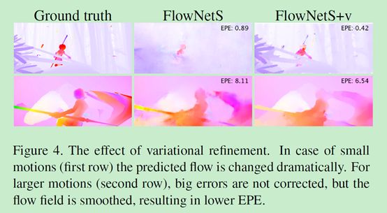 我们发现这个分辨率的在采用双线性向上采样相比,并没有显著提升结果。我们替换双线性上采样,采用没有匹配项的变分方法。记为 +v,这种放大方法比简单的双线性上采样计算量大,但是增加了变分方法的优点,使得图像更为平滑,以及得到subpixel-accurate flow filed。