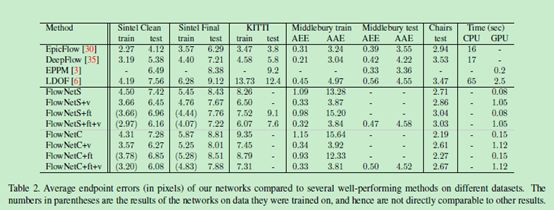 使用了四种数据集,前三种是目前比较常见的训练光流所用的数据集,flying chairs是文章自己创建的数据集。