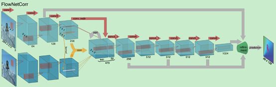 “FlowNetCorr”首先要先独立的提取俩图片的特征(使用相同的进程),然后再在高层次中把这两特征结合到一起。 这与正常的匹配的方法一致,先提取两个图片的特征,再对这些特征进行匹配。
