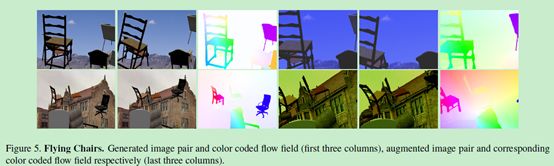 训练网络来预测光流需要足够大的训练集。虽然数据是在不断地增加,但现有的光流数据集仍然很小,无法达到训练网络的目的。对于真实的视频材料来说,获得光流场的基本信息是非常困难的。以现实的交易数量上,我们生成了一张合成的飞行椅数据集,它由来自Flickr的随机背景图像组成,我们将椅子的分段图像叠加在一起。这些数据与真实数据没什么共同之处,但我们可以用自定义属性生成任意数量的样本。在这些数据上进行训练的CNNs,即使没有进行微调,也能很好地推广到现实的数据集。