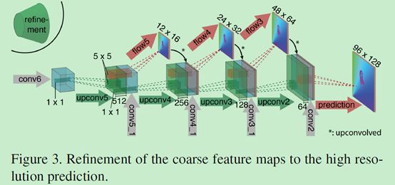 扩大部分主要是由上卷基层组成,上卷基层由unpooling(扩大featuremap,与pooling的步骤相反)和一个卷积组成,我们对featuremaps使用upconvolution,并且把它和收缩部分对应的feature map(灰色箭头)以及一个上采样的的光流预测(红色)联系起来。每一步提升两倍的分辨率,重复四次,预测出来的光流的分辨率依然比输入图片的分辨率要小四倍。这样就能既保留coarser特征图的高层信息,又能保留低层特征图的好的局部信息。