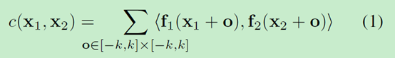 比如:只考虑f1、f2两特征图中的单独patch的比较。f1中以x1为中心的patch和f2中以x2位中心的patch之间的关联就定义为: