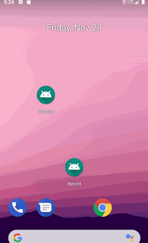 在Android 8.0(API级别26)及更高版本上,可以创建固定的快捷方式。与静态和动态快捷方式不同,固定的快捷方式在支持的启动器中显示为单独的图标。图1显示了这两种快捷方式之间的区别。