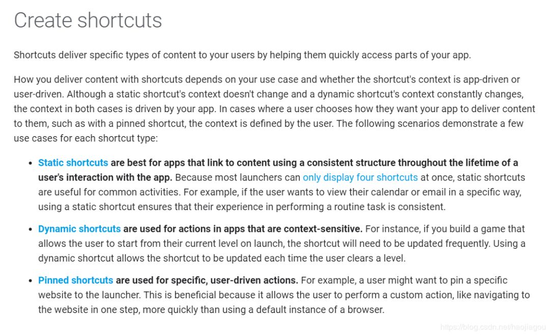 这是ShortcutManagerAPI的地址:https://developer.android.google.cn/reference/android/content/pm/ShortcutManager.html