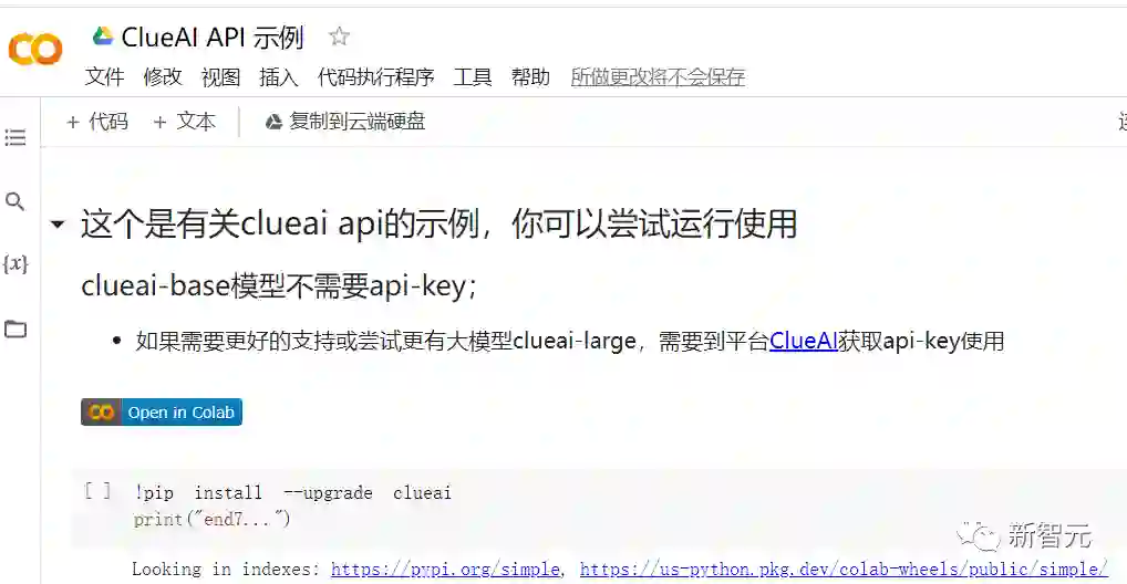 使用时也很方便,如果是基础模型直接运行即可,尝试大模型需要在ClueAI官方网站获取api-key才能使用。