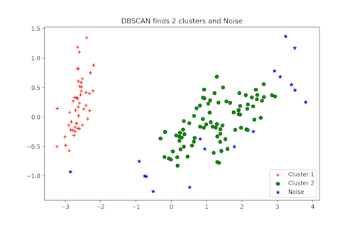 DBSCAN(带噪声的基于密度的空间聚类方法)是一种流行的聚类算法,它被用来在预测分析中替代 K 均值算法。它并不要求输入簇的个数才能运行。但是,你需要对其他两个参数进行调优。
