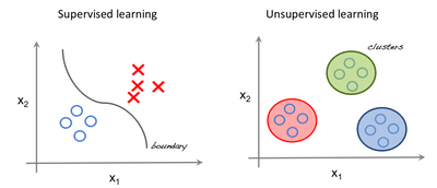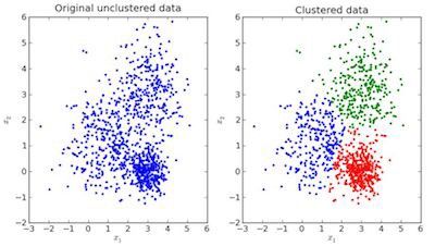 如上所示,左图是没有进行分类的原始数据,右图是进行聚类之后的数据(根据数据本身的特征将其分类)。当给出一个待预测的输入时,它会基于其特征查看自己从属于哪一个簇,并以此为根据进行预测。