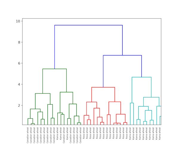层次聚类的实现可以用 dendrogram 进行展示。接下来,我们一起来看一个粮食数据的层次聚类示例。数据集链接:https://raw.githubusercontent.com/vihar/unsupervised-learning-with-python/master/seeds-less-rows.csv
