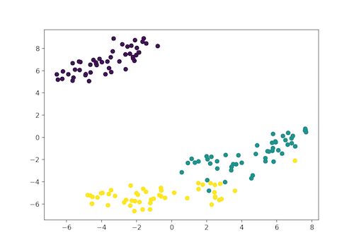 上图是一个监督学习的例子,它使用回归技术找到在各个特征之间的最佳拟合曲线。而在无监督学习中,根据特征对输入数据进行划分,并且根据数据所属的簇进行预测。